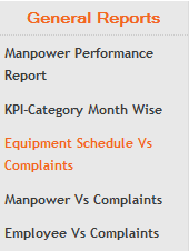 1. To view Equipment Schedule Vs Complaints, Select Equipment Schedule Vs Complaints from the options.